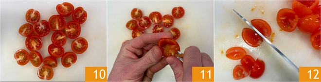 Lava los tomates cherry y córtalos por la mitad 10, elimina las semillas y la pulpa 11, luego córtalos en gajos 12.