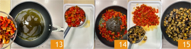En una sartén vierte el aceite y añade los pimientos 13, cocina durante 10 minutos y luego colócalos sobre papel absorbente 14. Pon en la sartén las berenjenas, fríe poco a poco, a fuego alto, dándoles la vuelta poco, hasta que se forme una costra crujiente, luego colócalas sobre papel absorbente 15.