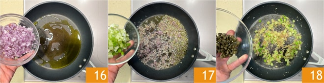 En una sartén vierte el aceite, añade las cebollas 16, el apio 17 y sofríe durante unos minutos. Incorpora las alcaparras bien escurridas 18.