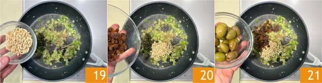 Añade también los piñones 19, mezcla para tostarlos. Incorpora luego las pasas 20 y las aceitunas 21. Mezcla y deja cocinar durante unos minutos.