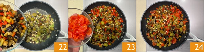 Apaga el fuego y añade en la sartén las berenjenas, los pimientos 22 y los tomates cherry 23. Ajusta de sal y pimienta, mezcla para dar sabor y amalgamar los ingredientes 24.