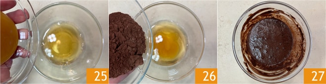 En un bol vierte el vinagre de vino blanco, añade la miel de azahar 25 y el cacao amargo 26. Mezcla hasta obtener una mezcla homogénea 27.
