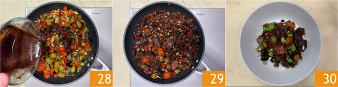 Vierte la mezcla en la sartén 28, enciende el fuego, mezcla y cocina durante 3-4 minutos 29, luego deja reposar durante al menos una hora. La caponata de berenjenas con salsa de cacao está lista, adorna con hojas de albahaca y sirve 30.