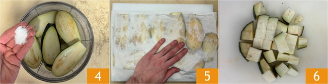 Pon las rodajas de berenjena con sal 4 durante 30 minutos. Luego sécalas con papel absorbente 5 y córtalas en dados 6.