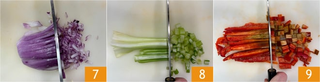 Pela la cebolla y pícala finamente 7. Lava el apio y córtalo en dados 8. Limpia un pimiento, eliminando el tallo y las semillas internas, lávalo y córtalo primero en tiras y luego en dados 9.