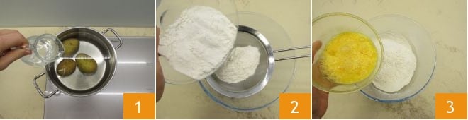 Para preparar los cappellacci de cotechino y crema de lentejas como primera cosa poned a hervir las patatas que servirán para el relleno 1. Harán falta unos 30-50 minutos dependiendo de su tamaño. Después, preparad la pasta al huevo: tamizad la harina en un bol 2, añadid los huevos previamente batidos 3