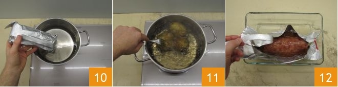 Mientras tanto, coced también el cotechino siguiendo las instrucciones indicadas en el envase, en nuestro caso se debía sumergir en agua fría y cocinar durante unos 30 minutos 10. En este momento las patatas también estarán cocidas, para verificar la cocción pinchadlas con las púas de un tenedor 11, si se hunden fácilmente significa que están cocidas. Escurridlas y reservadlas. Cuando el cotechino esté cocido, sacadlo del agua y desenvolvedlo 12, teniendo cuidado de no quemaros con el líquido contenido en el envoltorio.
