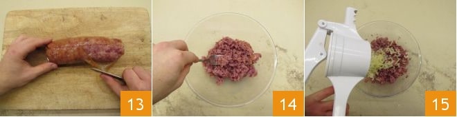 Trasladad el cotechino a una tabla de cortar y peladlo 13, luego trasladadlo de nuevo a un bol y aplastadlo con un tenedor 14. Aplastad también las patatas dentro del mismo bol 15,