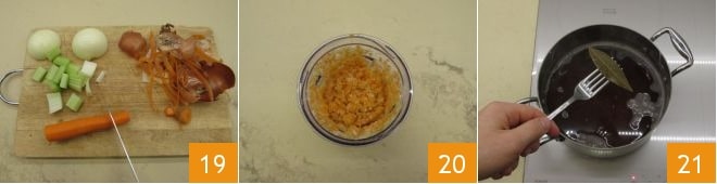 Pasad a las lentejas. Limpiad la zanahoria, cebolla y apio 19, picad finamente a cuchillo o utilizando una batidora 20. Tan pronto como las lentejas estén cocidas, eliminad el laurel 21.