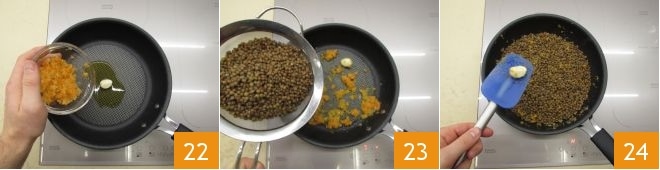 Escurridlas reservando el agua de cocción. En una sartén verted un hilo de aceite, añadid un diente de ajo y la mezcla picada 22. Dejad sazonar a fuego medio y añadid las lentejas 23. Saltead todo durante unos minutos, luego eliminad el diente de ajo 24.