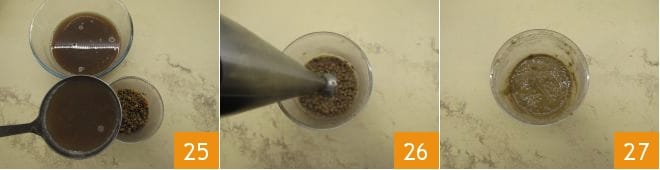 Trasladadlas al vaso de una batidora y añadiendo un poco de agua de cocción 25 batidlas con una batidora de inmersión 26 hasta obtener una crema lisa 27.