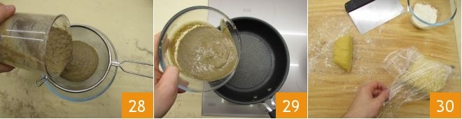 Para obtener una crema aún más aterciopelada tamizadla 28; luego trasladadla a un cazo 29 así podréis calentarla mientras salteáis la pasta. Ahora que todo está listo sólo os queda ocuparos de la pasta. Tomad un trozo de masa, el resto cubridlo de nuevo con el film 30, y enharinad ligeramente con la harina de sémola de trigo duro.