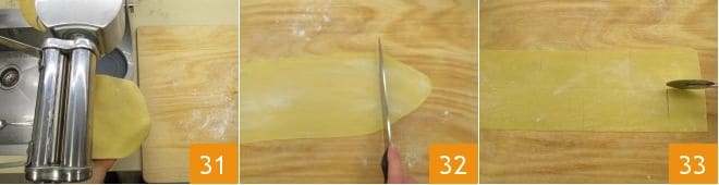 Utilizando una máquina de pasta, o sobre una tabla con el rodillo, id obteniendo una lámina muy fina 31. En el caso de la amasadora recordad empezar por el número más grande hasta llegar al más pequeño. Solo si es necesario podréis añadir un poco de harina de sémola de trigo duro. Eliminad los bordes si son demasiado gruesos 32 y luego obtened cuadrados de 7-8 cm 33.