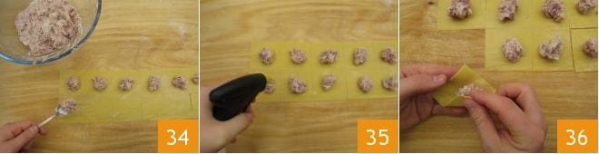 Verted en el medio de cada cuadrado aproximadamente medio cucharadita de relleno 34 y luego mojad solo dos de los lados con un poco de agua. Ayudaos con un atomizador 35 o con un pincel. En este punto proceded con el cierre y la formación del cappellaccio. Juntad dos puntas opuestas hasta formar un triángulo 36.