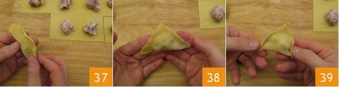 Luego pellizcad con los dedos todos los bordes 37 hasta cerrarlos completamente y sacando el aire. Aplastad las extremidades del triángulo directamente sobre la superficie de trabajo, con las puntas de los pulgares empujad la barriga hacia arriba y finalmente juntad las dos extremidades tirándolas hacia abajo, en dirección opuesta a la punta 39.
