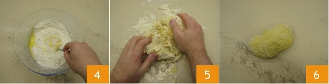 y empezad a mezclar con un tenedor 4 para amalgamar los ingredientes. Luego, trasladad la mezcla a una superficie 5 y trabajadla con las manos hasta obtener una mezcla homogénea 6.