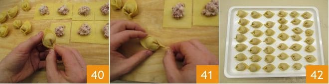 Pellizcad con los dedos para sellar 40 y si fuese necesario podéis eliminar un pedacito de masa que de otro modo resultaría demasiado grueso 41. A medida que formáis los cappellacci (con estas cantidades saldrán unos 60) acomodadlos en una bandeja ligeramente enharinada con la harina de sémola de trigo duro. Una vez terminados todos 42 no os queda más que poner al fuego una olla llena de agua, salada al gusto; servirá para la cocción.