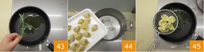 Mientras tanto, en una sartén verted un poco de aceite y sazonad con una ramita de romero y un par de hojas de salvia. Tan pronto como el agua empiece a hervir verted los cappellacci en la olla y cocedlos de 2 a 4 minutos, dependiendo de cuánto tiempo los hayáis dejado al aire a secar. Cuando los cappellacci estén cocidos escurridlos directamente en el condimento de aceite, romero y salvia; salteadlos brevemente.
