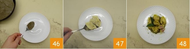 Luego en un plato verted un poco de crema de lentejas 46 y en el medio colocad los cappellacci 47. Adornad con un poco de salvia, unas hojitas de romero y una molienda de pimienta 48. ¡Aquí tenéis listos vuestros cappellacci con cotechino y crema de lentejas!