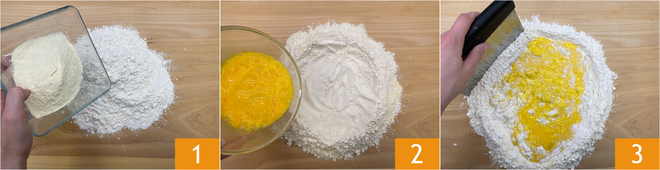 Para preparar los cappellacci rellenos de calabaza y amaretti sobre fondue de provola, comiencen con la pasta de huevo: Sobre la mesa de trabajo viertan la harina 00 y la sémola 1, formen una fuente y viertan en el centro los huevos 2. Comiencen a incorporar la harina a los huevos utilizando un tenedor o una rasqueta 3.