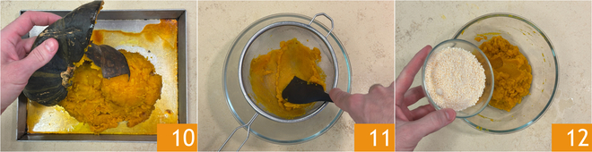 Horneen en horno estático precalentado a 200°, durante unos 45 minutos. Cuando la calabaza esté blanda, eliminen la cáscara 10 y aplasten la pulpa; para obtener una consistencia lisa y cremosa pueden pasarla por un colador 11. Agreguen el queso rallado 12.