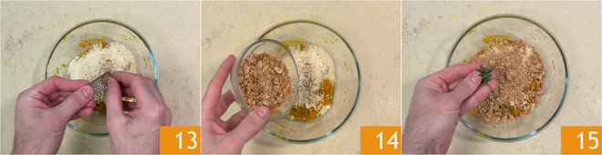 Añadan también la nuez moscada rallada 13, los amaretti desmenuzados 14 y el tomillo deshojado 15.