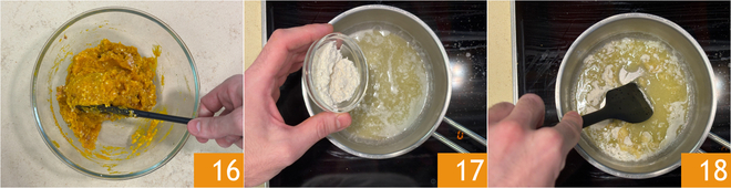Mezclen bien, luego transfieran el relleno a una manga pastelera y guarden en el frigorífico por unos veinte minutos 16. Mientras tanto, dedíquense a la fondue: derritan la mantequilla en un cazo, luego agreguen la harina 17. Mezclen bien con una espátula asegurándose de que la harina no se queme, tomará un par de minutos 18.