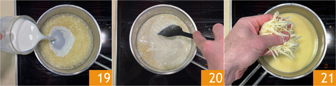 Cuando la harina esté tostada, viertan la leche poco a poco 19 y continúen mezclando a fuego bajo 20. Tan pronto como empiece a hervir suavemente, agreguen la provola ahumada que habrán rallado previamente 21.