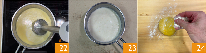 Mezclen para derretir completamente el queso, luego apaguen el fuego y mezclen 22 para obtener una fondue lisa y fundente 23. Recuperen el bloque de masa y espolvoréenlo ligeramente con harina 24.