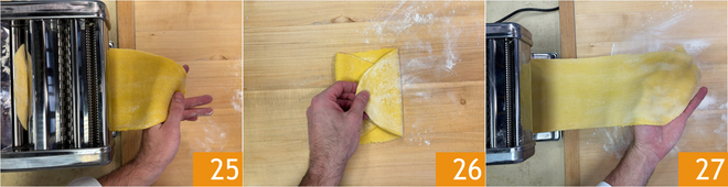 Extiendan la masa con una máquina de rodillo, comenzando con el grosor más ancho de los rodillos 25 y reduciéndolo poco a poco, doblando las hojas entre cada paso para reforzarlas 26. Continúen estirando la masa hasta llegar a un grosor de aproximadamente 1-1,5 mm 27.