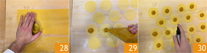 Con un cortador de pasta del diámetro de 7-8 cm, corten discos 28; con estas cantidades obtendrán aproximadamente 24, pueden volver a amasar los restos y estirarlos nuevamente después del tiempo de reposo de la masa. Expriman un montículo del relleno de calabaza y amaretti en el centro de cada uno 29. Rocíen muy poca agua en los bordes para facilitar el cierre 30.