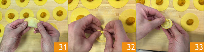 Doblen los discos por la mitad formando una media luna 31, luego giren los extremos hasta que se superpongan y pellízquenlos juntos 32. Después de formar todos los cappellacci, cocínenlos en agua salada y a fuego lento durante unos minutos 33.