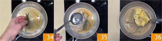 Mientras tanto, preparen el condimento: derritan la mantequilla en una sartén a fuego lento, cuando tome un bonito color avellana agreguen el tomillo 34 y un cucharón de agua de cocción de la pasta 35. Muevan ligeramente la sartén para amalgamar el condimento y hacerlo cremoso. Escurran los cappellacci en la sartén 36.