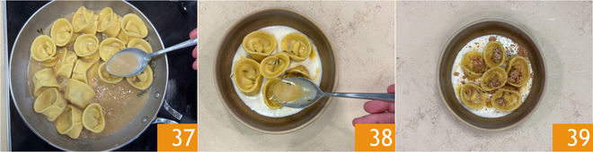 Déjenlos absorber rápidamente el condimento cubriéndolos con él 37. Están listos para emplatar: distribuyan la fondue en la base del plato, luego añadan los cappellacci con el condimento 38 y completen con algunos amaretti desmenuzados al momento. ¡Sus cappellacci rellenos de calabaza y amaretti sobre fondue de provola están listos para servirse 39!