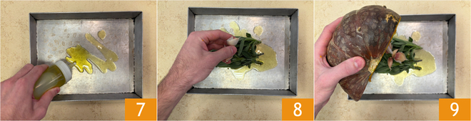 Mientras tanto, ocúpense del relleno: en una bandeja de horno viertan un poco de aceite 7, luego formen un montón con las hojas de salvia y los dientes de ajo 8. Colocan la calabaza dividida por la mitad, ya vaciada de semillas, con la parte cortada hacia abajo envolviendo los aromas en la cavidad 9.