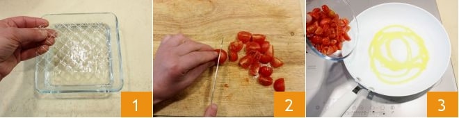 Para preparar la caprese fingerfood, pon a remojar la gelatina en hojas en un bol con agua fría durante al menos 10 minutos 1. Lava los tomates cherry bajo abundante agua corriente fría, luego córtalos por la mitad 2 y hazlos pasar en una sartén grande antiadherente con el aceite 3,