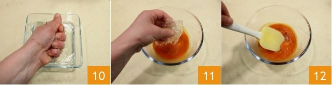 Pasado el tiempo necesario, escurre la gelatina en hojas 10 y añádela a la salsa caliente que has preparado 11, mezclando con la espátula 12 hasta que la gelatina se haya disuelto completamente.