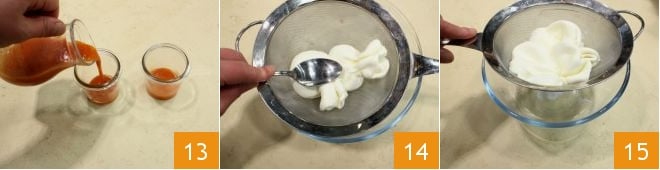 Forma la primera capa de tu caprese, vertiendo la salsa en 4 vasitos con capacidad de 100 ml 13, luego colócalos en el frigorífico para que se solidifiquen durante al menos 1 hora. Mientras tanto, prepara la segunda capa, colocando la stracciatella en un colador de malla fina y presionando con el dorso de una cucharilla 14 para que libere el líquido en exceso 15. Deja escurrir la stracciatella y ocúpate de la crema de albahaca.
