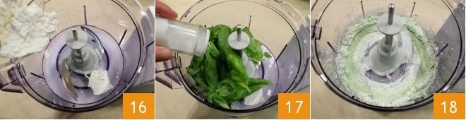 Coloca la ricotta en un procesador de alimentos con cuchillas 16 y añade las hojitas de albahaca, ajustando de sal 17 y pimienta a tu gusto. Pon en funcionamiento las cuchillas hasta obtener una mezcla homogénea y cremosa 18, que pondrás en una manga pastelera sin boquilla, a la que puedes hacerle un agujero.