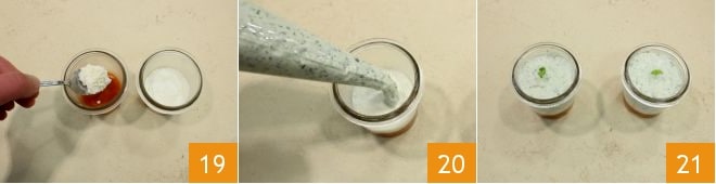 Pasado el tiempo necesario, continúa con la composición de los vasitos: deshilacha la stracciatella y realiza la segunda capa 19, finalmente termina vertiendo la crema de albahaca hasta el borde con la ayuda de la manga pastelera 20: tu caprese fingerfood está lista para ser servida y disfrutada; podrías decorarla con pequeñas hojitas de albahaca 21.