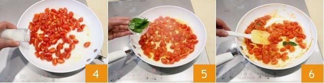 ajustando de sal 4 y de pimienta. Añade las hojitas de albahaca 5 y mezcla con una espátula, cocinando a fuego moderado durante 20 minutos. Una vez que los tomates cherry estén listos 6, apaga el fuego