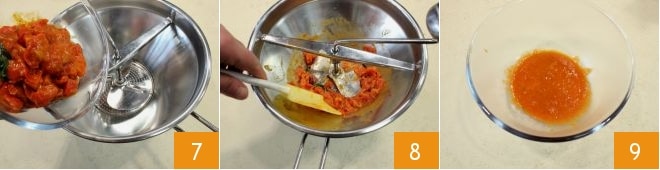 y pásalos por un pasapurés 7, insistiendo particularmente en las pieles 8, para obtener una salsita 9.