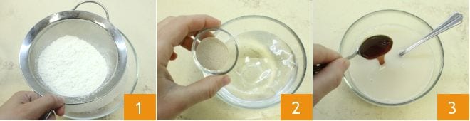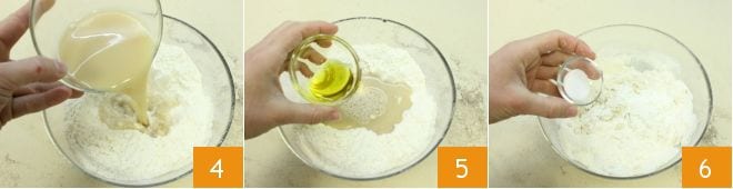 Vierte la mezcla en el bol con la harina 4, añade el aceite de oliva 5 y la sal 6.