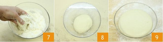 Mezcla los ingredientes con las manos 7 y traslada la masa a una superficie de trabajo y amasa hasta obtener un bollo liso, transfiere el bollo a un bol, cúbrelo con film transparente 8 y colócalo en el horno apagado con la luz encendida para que repose durante 2 horas. Pasado el tiempo de reposo, el bollo habrá duplicado su volumen 9,