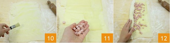trasládalo a la superficie de trabajo y extiende una masa de 25x35 cm, pincela la superficie con una mezcla de huevo batido con una cucharada de leche 10. Ahora pasa al relleno: coloca sobre la superficie de la masa de pan las lonchas de fontina dejando 2 cm de borde para facilitar el enrollado. Distribuye los dados de jamón cocido 11. Ahora enrolla la masa por el lado largo 12,