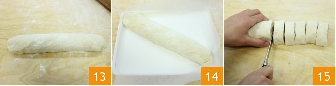 una vez enrollado el rollo 13 transfiérelo a una bandeja cubierta con papel de horno 14 y déjalo reposar en el frigorífico al menos media hora. Pasado este tiempo, corta el rollo en rebanadas de 2,5 cm de grosor 15, obtendrás aproximadamente 12 caracoles, transfiérelos a una bandeja para hornear forrada con papel de horno, deja que los caracoles reposen para que fermenten durante al menos 1 hora en el horno apagado con la luz encendida.