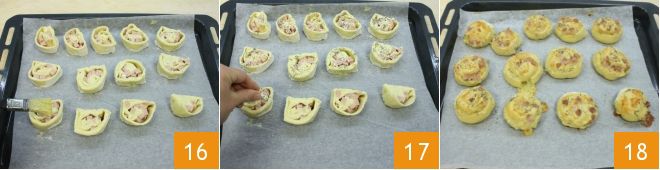 Pincela la superficie de los caracoles con la emulsión de leche y huevo batido 16, espolvorea con las semillas de amapola 17 y cocina en horno estático precalentado a 180° durante 25 minutos (o en horno ventilado a 160° durante 15-20 minutos) hasta que los bocados estén dorados. ¡Tus caracoles de pan rellenos de jamón cocido y fontina están listos 18 para ser servidos!