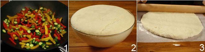 Preparad la masa de pan siguiendo los pasos que encontrarás haciendo clic aquí, luego dejadla levar hasta que duplique su volumen 2. Mientras tanto, lavad y cortad las verduras en pequeñas tiras, y salteadlas unos minutos en la sartén 1 con una cucharada de aceite, luego añadid sal y apagad el fuego. Dividid la masa en dos partes, que extenderéis con un rodillo formando dos rectángulos de un grosor de aproximadamente medio centímetro 3.