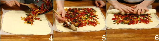 Sobre un rectángulo de masa, extendéis las verduras dejando un par de cm en los bordes 4, que pincelaréis con un poco de agua 5. Enrollad la masa rellena sobre sí misma formando un rollo 6 que sellaréis 7 y dejaréis levar con el cierre hacia abajo.