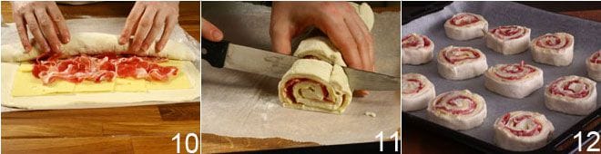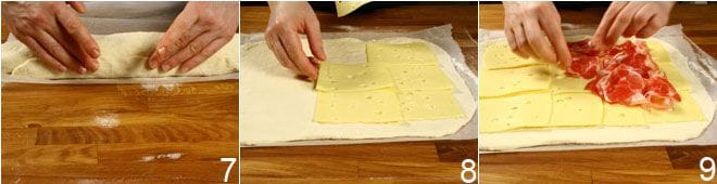Tomad el segundo rectángulo de masa, rellenadlo con lonchas de queso 8 y panceta 9, y enrolladlo 10 pincelando los bordes con agua para sellarlo.